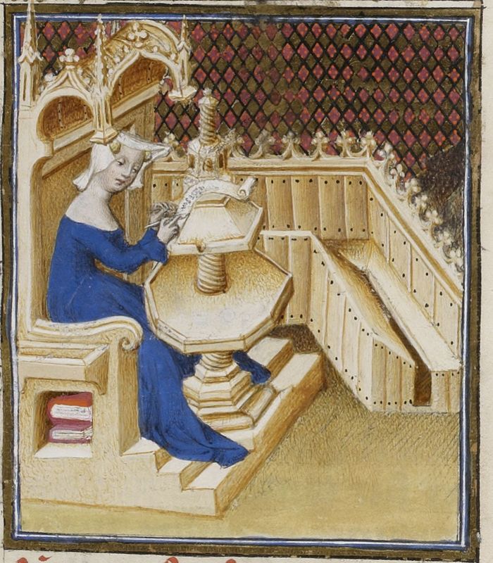 Parigi, Bibliothèque Nationale de France, Fr. 598, f. 31r. La sibilla Eritrea intenta a scrivere ad un leggio.