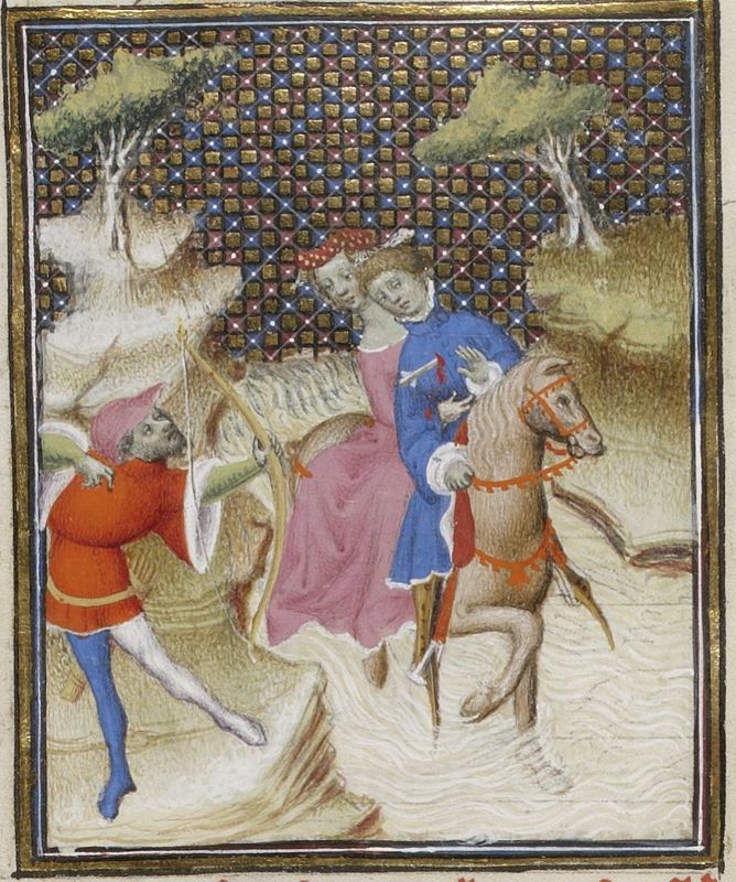 Maestro delle Clères Femmes e collaboratore (1403 c.), Ercole scocca una freccia contro il centauro Nesso