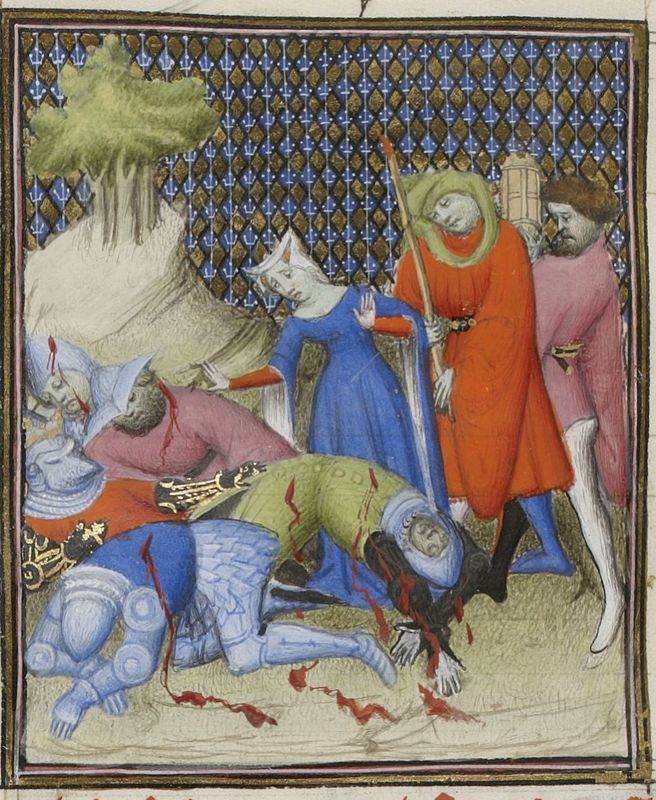 Parigi, Bibliothèque Nationale de France, Fr. 598, f. 41v. Argia cerca il corpo del marito tra i cadaveri sul campo di battaglia.