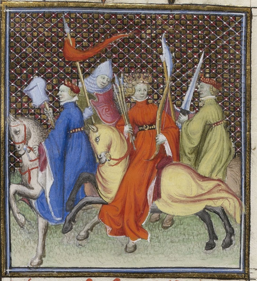 Parigi, Bibliothèque Nationale de France, Fr. 598, f. 46r. Pentesilea regina delle Amazzoni, armata di arco e frecce, guida il suo esercito di guerriere a cavallo.