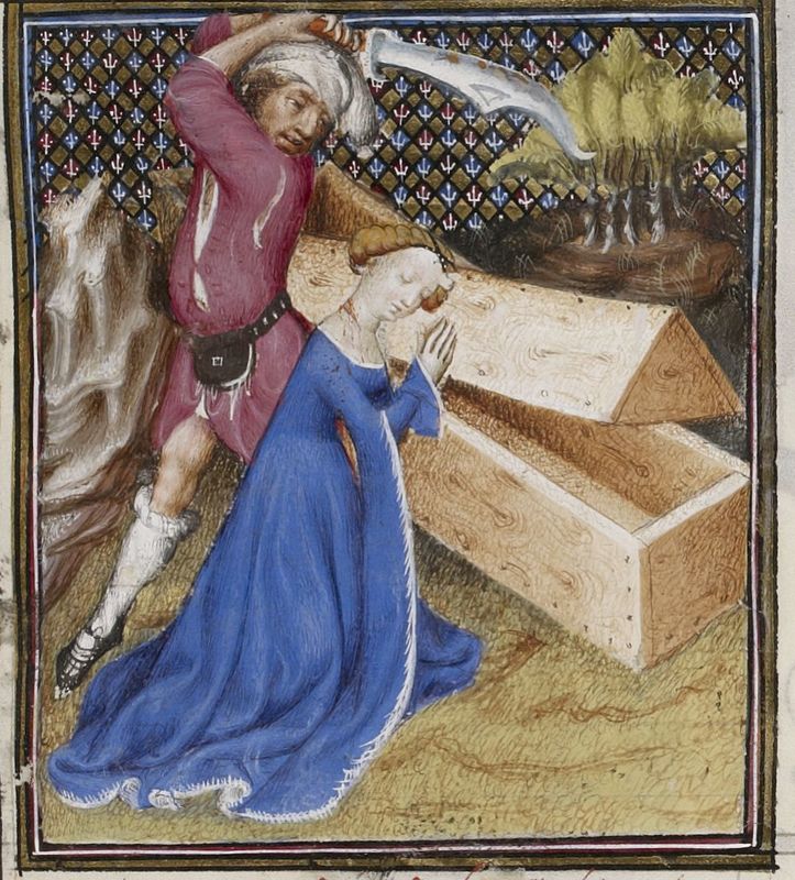 Parigi, Bibliothèque Nationale de France, Fr. 598, f. 47r. Polissena viene sacrificata da Neottolemo sulla tomba di Achille.