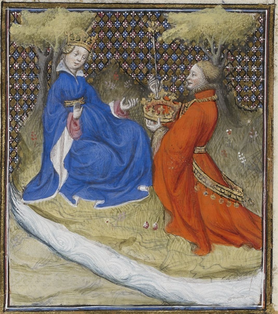 Parigi, Bibliothèque Nationale de France, Fr. 598, f. 60r. Enea offre la sua corona e il suo scettro a Lavinia.