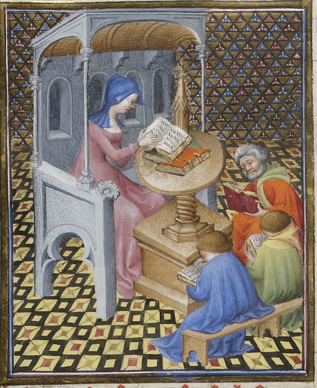 Parigi, Bibliothèque Nationale de France, Fr. 598, f. 71v. La poetessa Saffo, seduta al leggio, sfoglia un libro circondata dai suoi discepoli.
