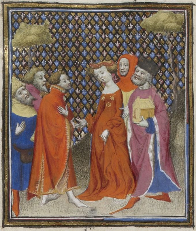 Parigi, Bibliothèque Nationale de France, Fr. 598, f. 82v. Megulia Dotata riceve dal padre una ricca dote per il matrimonio.