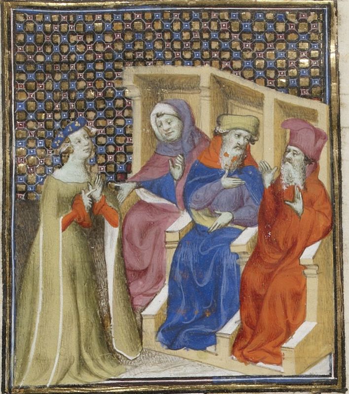 Parigi, Bibliothèque Nationale de France, Fr. 598, f. 124v. Ortensia perora la causa delle donne romane dinanzi ai triumviri.