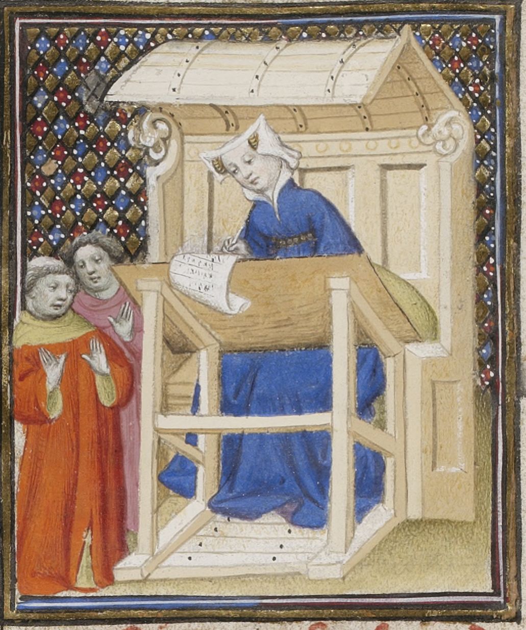 Parigi, Bibliothèque Nationale de France, Fr. 598, f. 126r. La poetessa Cornificia intenta a scrivere allo scrittoio, accanto a due discepoli.