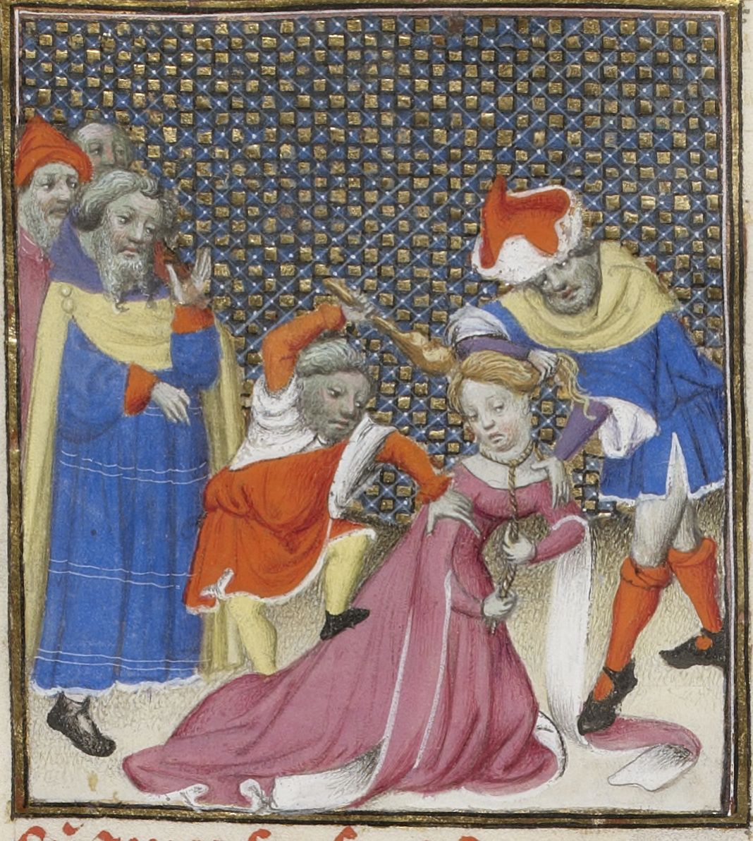 Parigi, Bibliothèque Nationale de France, Fr. 598, f. 138v. Epicari si impicca per sfuggire alle torture inflittele per ordine di Nerone.