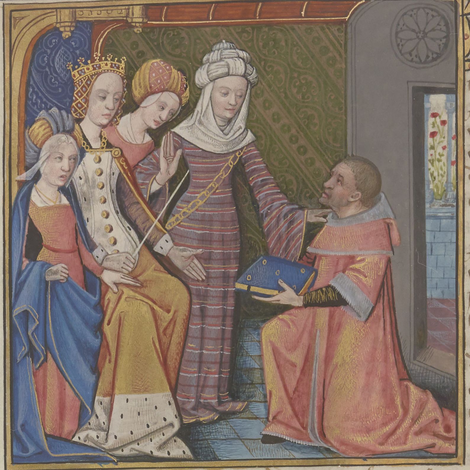 Parigi, Bibliothèque Nationale de France, Fr. 599, f. 2v. Il copista del manoscritto è Johannes Michel. L'autore Giovanni Boccaccio offre il libro alla regina Giovanna I, circondata dalle donne della sua corte.