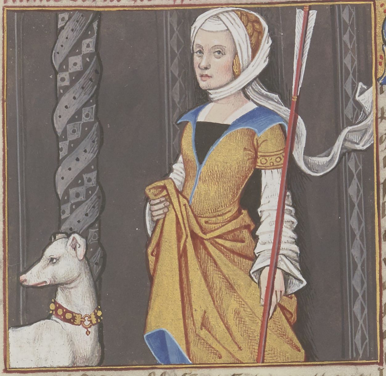 Parigi, Bibliothèque Nationale de France, Fr. 599, f. 5v. Il copista del manoscritto è Johannes Michel. La regina Semiramide con una lunga freccia in mano e un levriero al fianco.