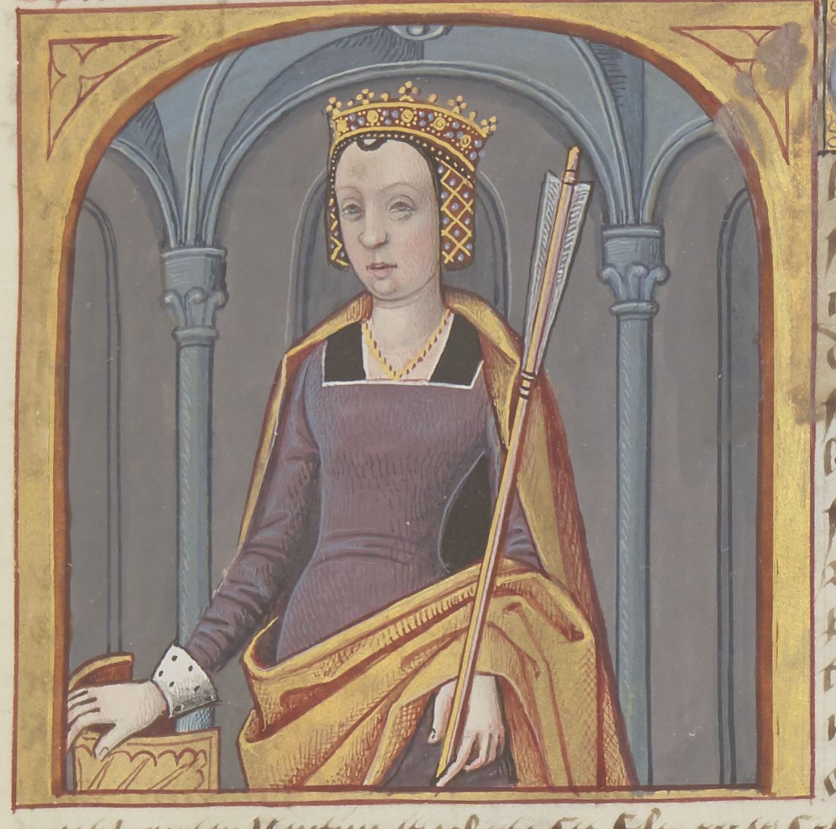 Parigi, Bibliothèque Nationale de France, Fr. 599, f. 7r. Il copista del manoscritto è Johannes Michel. La dea Opi con una lunga freccia e uno scudo.