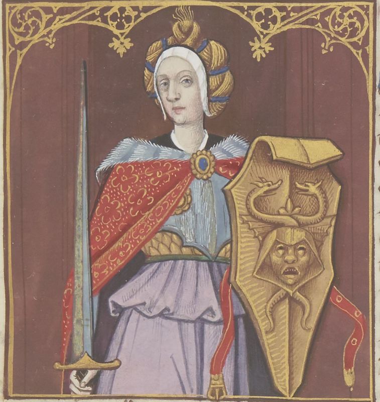 Parigi, Bibliothèque Nationale de France, Fr. 599, f. 9r. Il copista del manoscritto è Johannes Michel. La dea Minerva con la spada e lo scudo su cui è effigiata la testa della Gorgone.