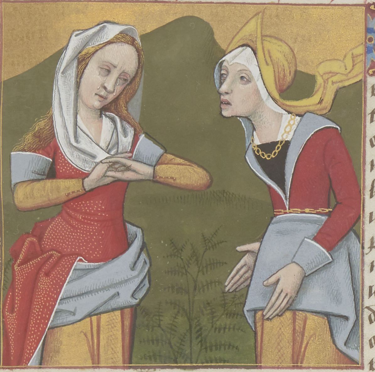 Parigi, Bibliothèque Nationale de France, Fr. 599, f. 26r. Il copista del manoscritto è Johannes Michel. Le mogli dei Menii piangono i loro mariti.