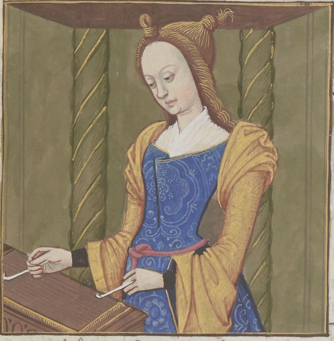 Parigi, Bibliothèque Nationale de France, Fr. 599, f. 29r. Il copista del manoscritto è Johannes Michel. Cassandra suona la cetra.