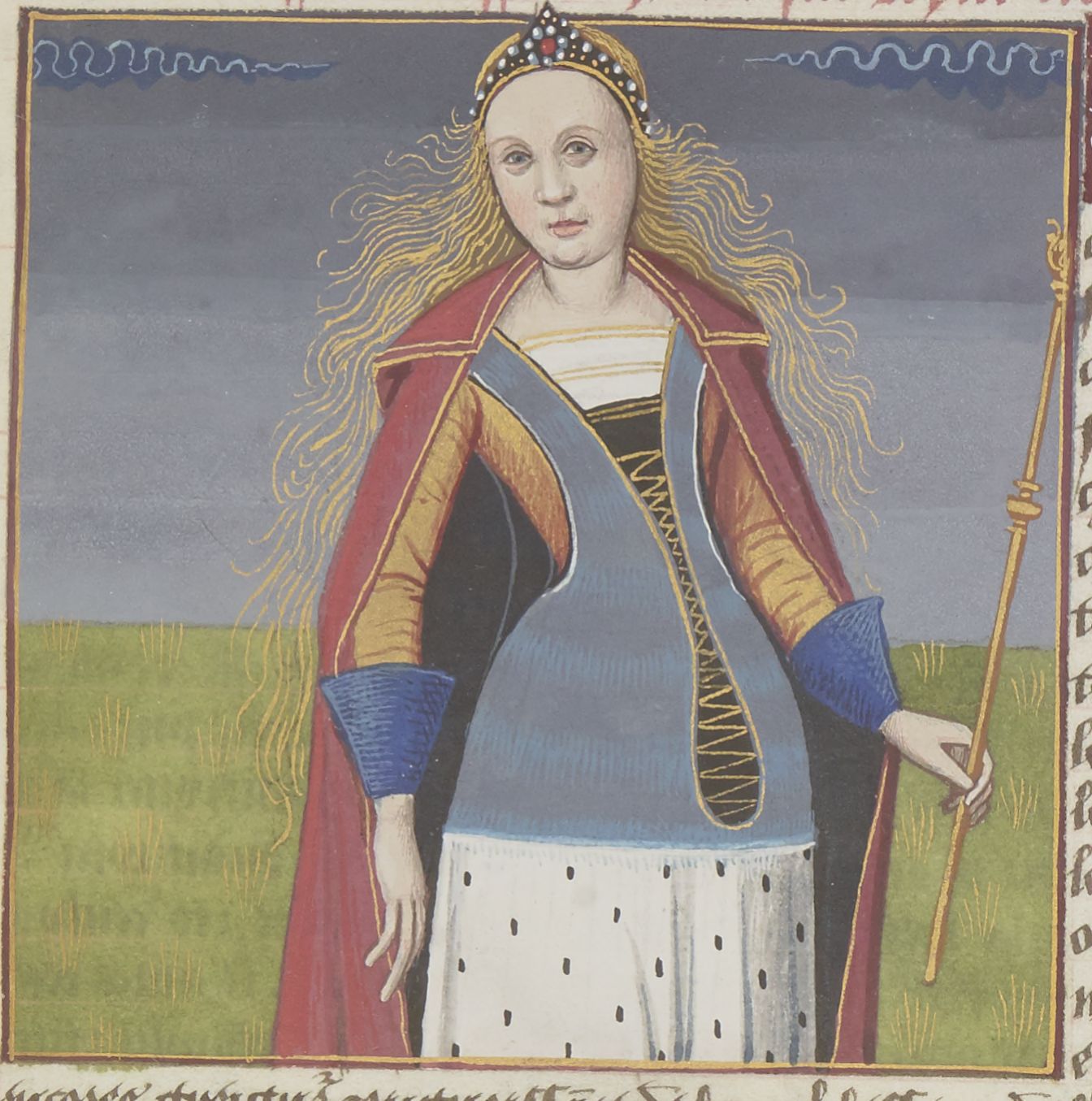 Parigi, Bibliothèque Nationale de France, Fr. 599, f. 36r. Il copista del manoscritto è Johannes Michel. Didone, regina di Cartagine, con lo scettro del comando.