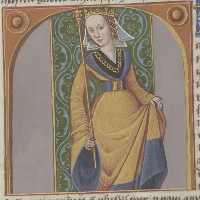 Parigi, Bibliothèque Nationale de France, Fr. 599, f. 39v. Il copista del manoscritto è Johannes Michel. Nicaula, regina d'Etiopia, con uno scettro.