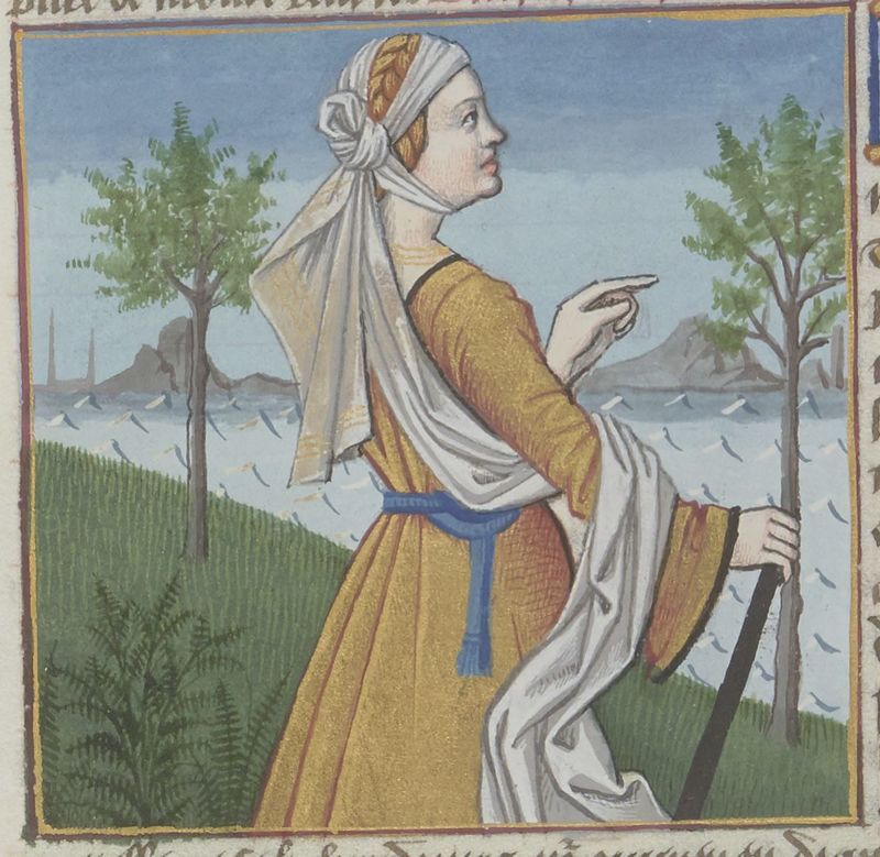 Parigi, Bibliothèque Nationale de France, Fr. 599, f. 41v. Il copista del manoscritto è Johannes Michel. Gaia Cirilla sulla riva del Tevere.