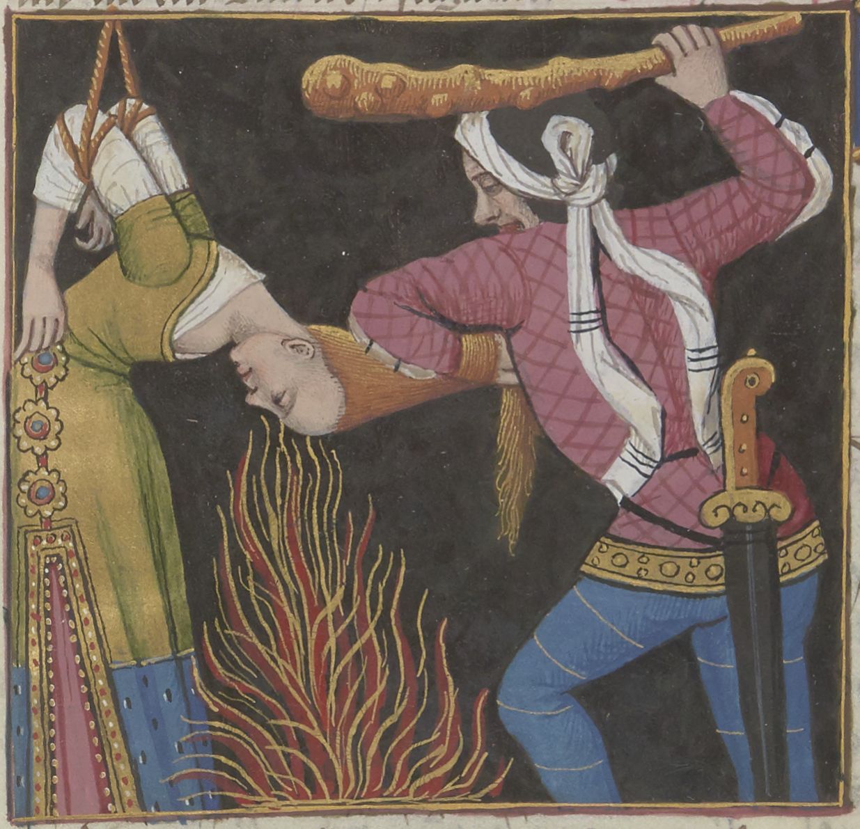 Parigi, Bibliothèque Nationale de France, Fr. 599, f. 44v. Il copista del manoscritto è Johannes Michel. Il supplizio di Leena.