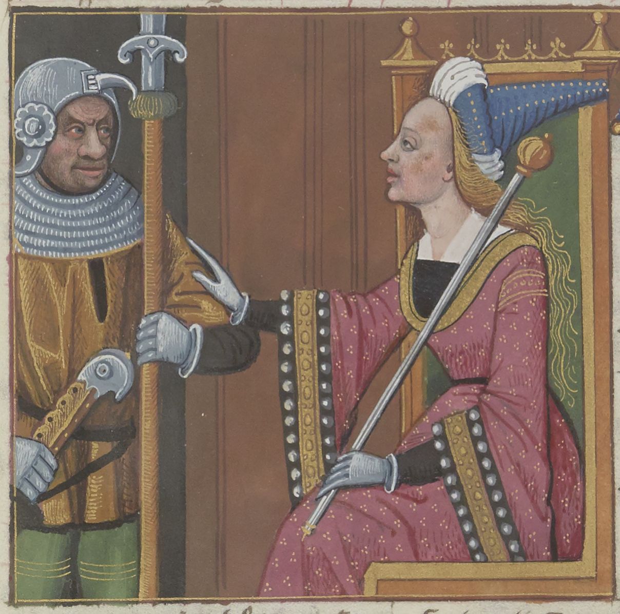 Parigi, Bibliothèque Nationale de France, Fr. 599, f. 45v. Il copista del manoscritto è Johannes Michel. Atalia, regina di Gerusalemme, dà ordini a un soldato.
