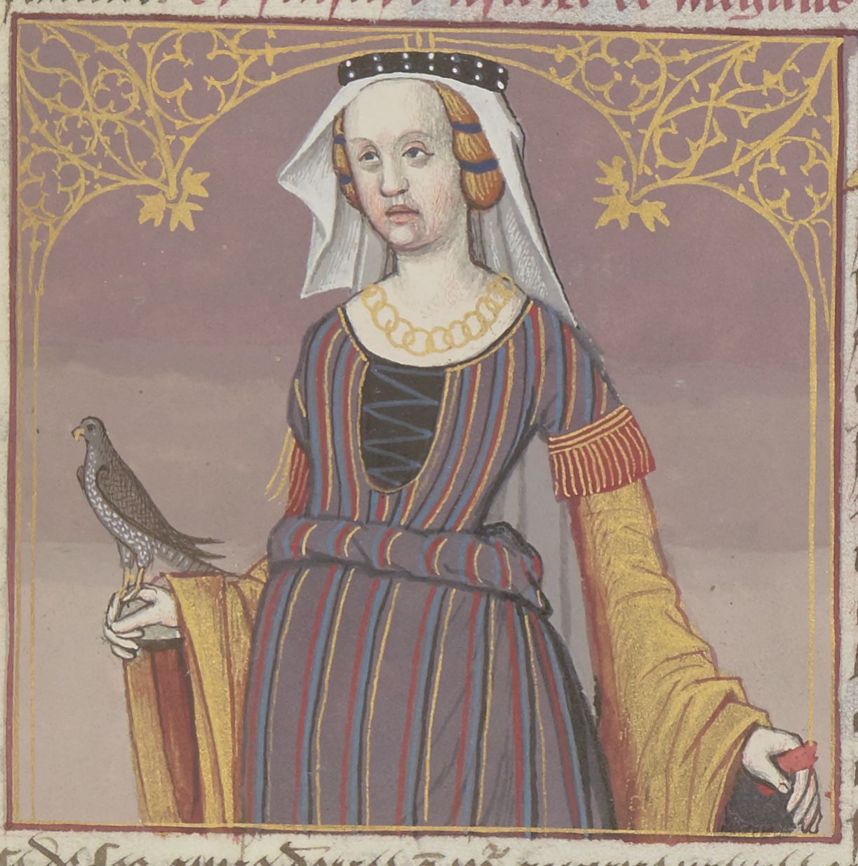 Parigi, Bibliothèque Nationale de France, Fr. 599, f. 48r. Il copista del manoscritto è Johannes Michel. Megulia Dotata con un falcone.