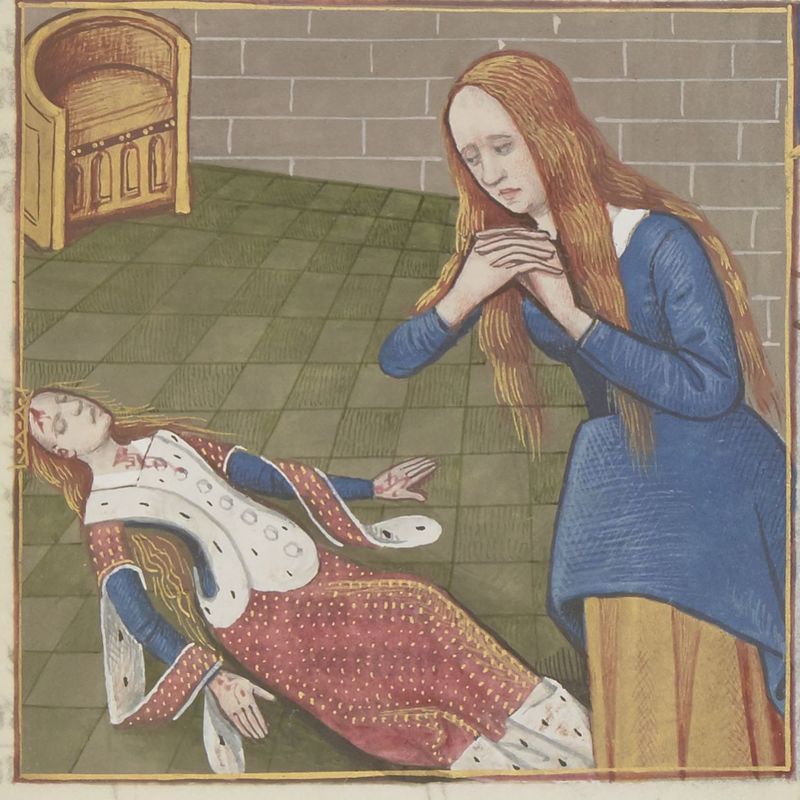 Parigi, Bibliothèque Nationale de France, Fr. 599, f. 59r. Il copista del manoscritto è Johannes Michel. Armonia piange la morte della giovane schiava morta al suo posto.