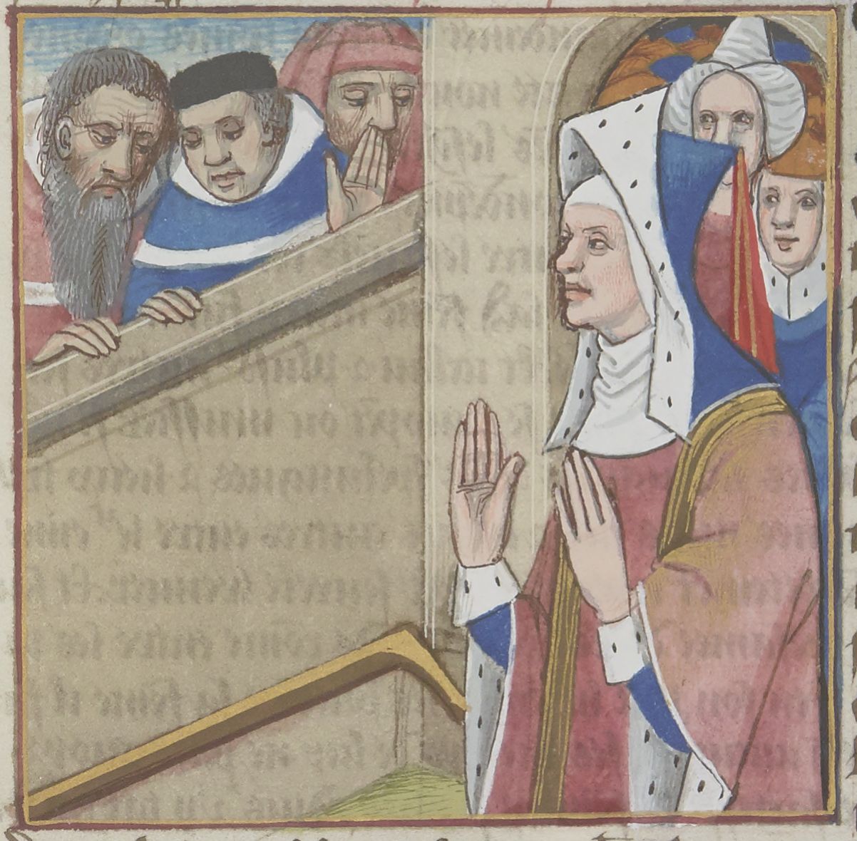 Parigi, Bibliothèque Nationale de France, Fr. 599, f. 71v. Il copista del manoscritto è Johannes Michel. Ortensia perora la causa delle donne romane dinanzi al Triumvirato.
