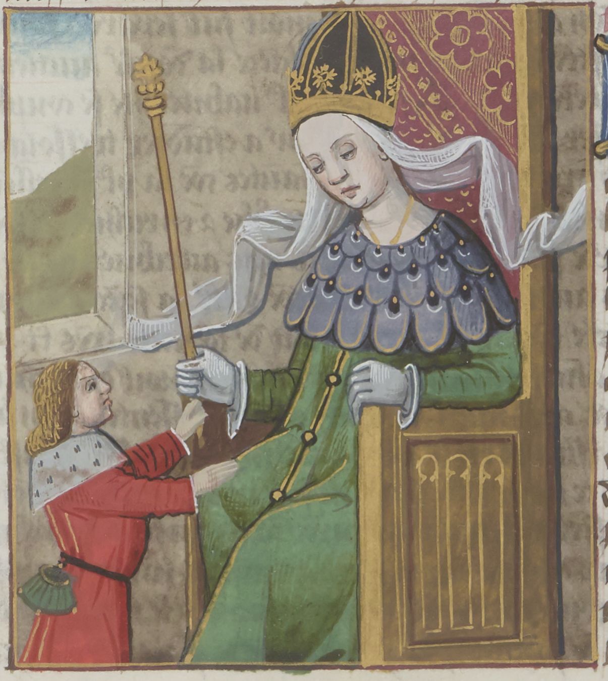 Parigi, Bibliothèque Nationale de France, Fr. 599, f. 88v. Il copista del manoscritto è Johannes Michel. L'imperatrice Irene con il giovane figlio Costantino.