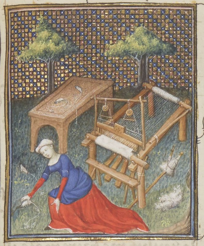 Parigi, Bibliothèque Nationale de France, Fr. 12420, f. 69r. Panfila raccoglie i bozzoli dei bachi da seta.