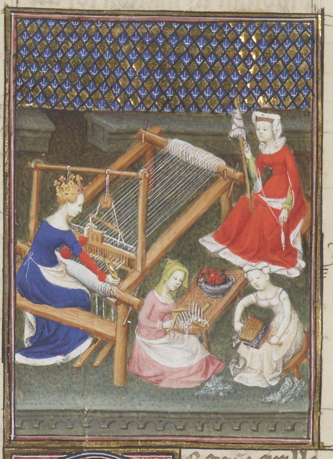 Parigi, Bibliothèque Nationale de France, Fr. 12420, f. 71r. Gaia Cirilla lavora al telaio in compagnia di due donne che filano, tessono e cardano.