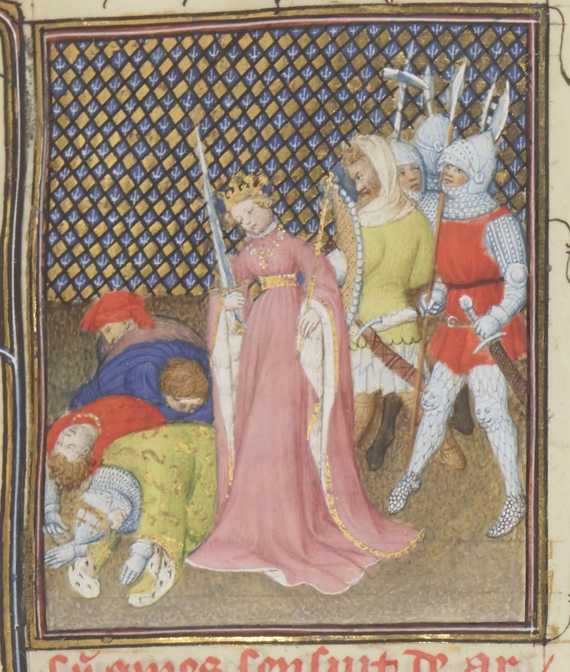 Parigi, Bibliothèque Nationale de France, Fr. 12420, f. 87r. Artemisia guida l'esercito sul campo di battaglia.