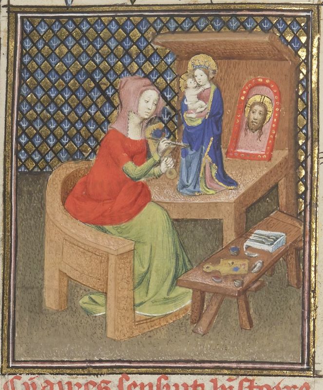 Parigi, Bibliothèque Nationale de France, Fr. 12420, f. 92v. Irene dipinge la statua di una Madonna con bambino.