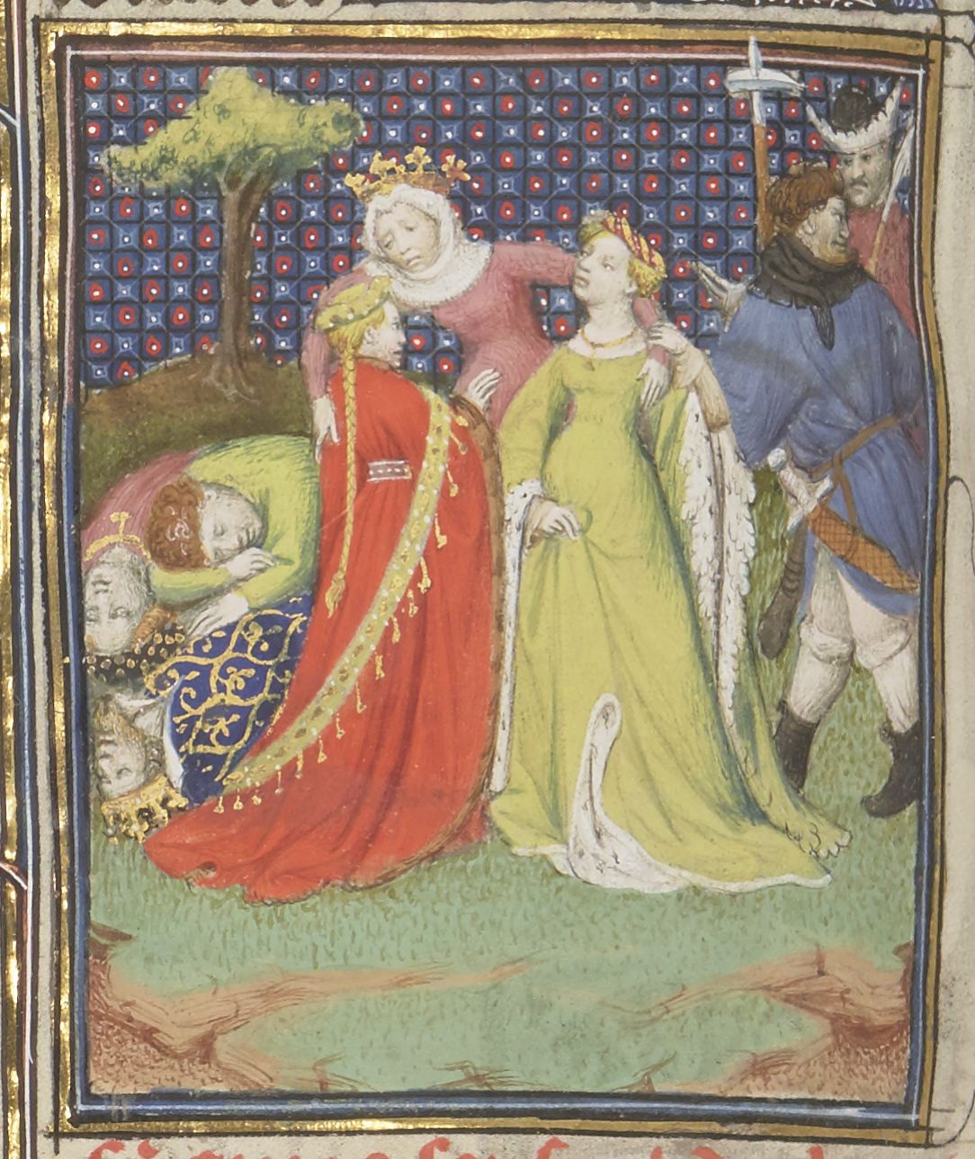 Parigi, Bibliothèque Nationale de France, Fr. 12420, f. 93v. La regina Olimpiade, assistita da due ancelle, viene raggiunta dai sicari mandati per ucciderla.