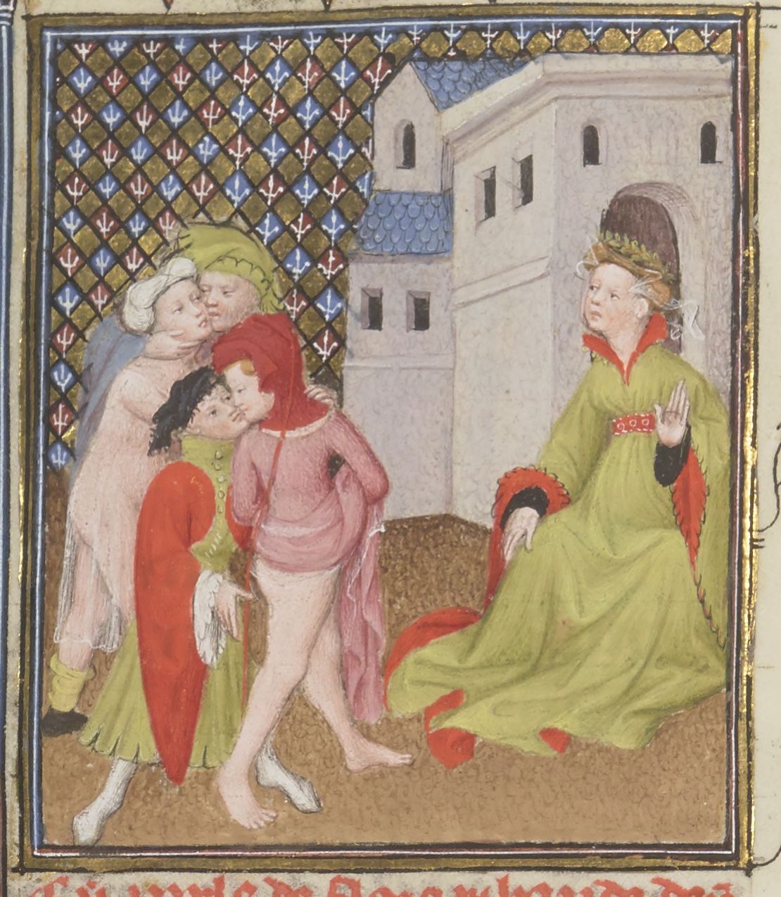 Parigi, Bibliothèque Nationale de France, Fr. 12420, f. 98v. Flora osserva due coppie che si baciano e si abbracciano.
