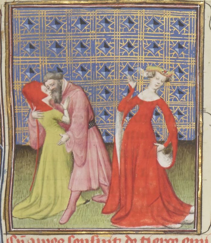 Parigi, Bibliothèque Nationale de France, Fr. 12420, f. 113r. Terza Emilia scopre e perdona il tradimento del marito Scipione con una giovane serva.
