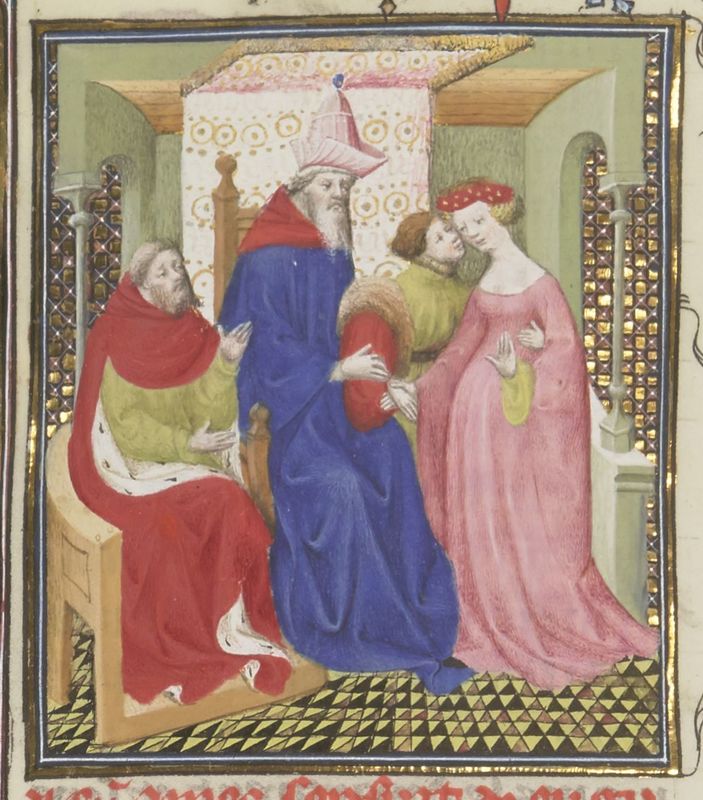Parigi, Bibliothèque Nationale de France, Fr. 12420, f. 158v. L'imperatore Ottone ordina il matrimonio tra Gualdrada e il conte Guido.