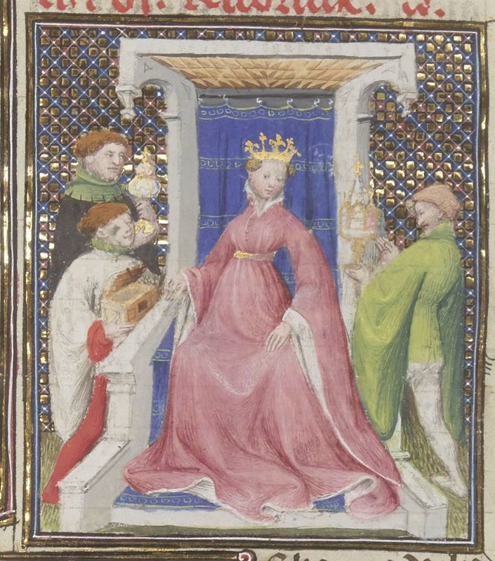 Parigi, Bibliothèque Nationale de France, Fr. 12420, f. 165r. La regina Giovanna I, seduta in trono, riceve l'omaggio dei suoi sudditi.