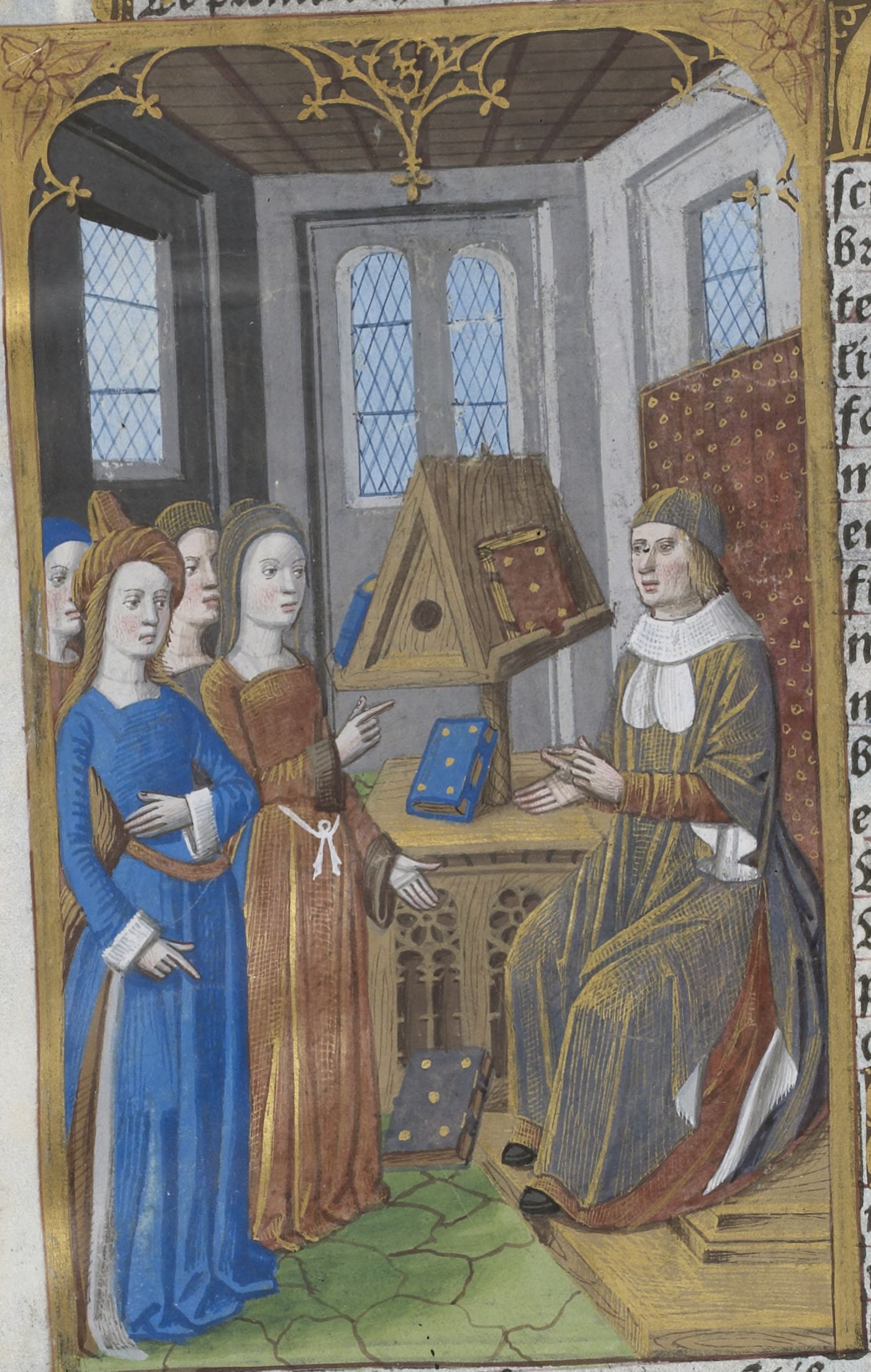 Parigi, Bibliothèque Nationale de France, Vélins 1223, f. a3v. Incunabolo miniato stampato a Parigi da Antoine Vérard il 26/04/1493. Giovanni Boccaccio seduto in cattedra insegna ad un gruppo di donne.