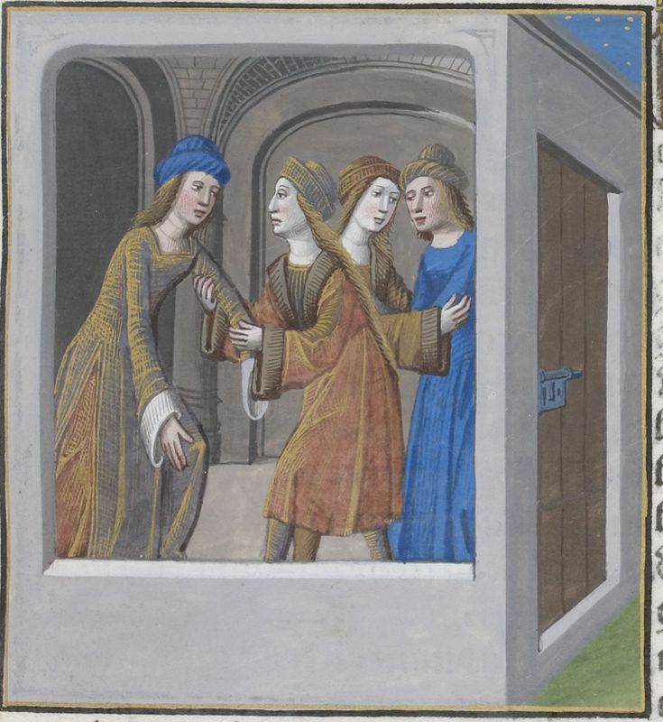 Parigi, Bibliothèque Nationale de France, Vélins 1223, f. e4r. Incunabolo miniato stampato a Parigi da Antoine Vérard il 26/04/1493. Le mogli dei Menii prendono il posto dei loro mariti in prigione.