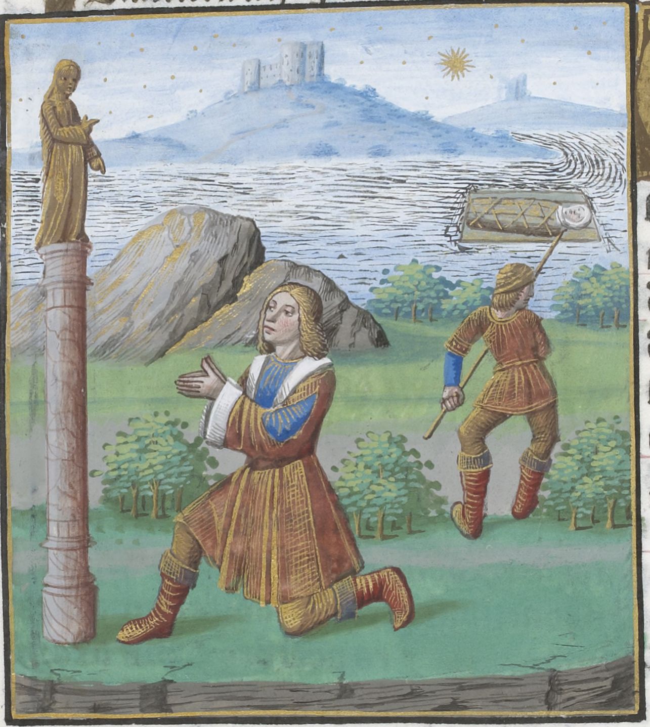 Parigi, Bibliothèque Nationale de France, Vélins 1223, f. f6v. Incunabolo miniato stampato a Parigi da Antoine Vérard il 26/04/1493. Metabo consacra la figlia Camilla alla dea Diana, quindi pone la bimba in fasce su una zattera e la spinge nella corrente del fiume Amaseno.
