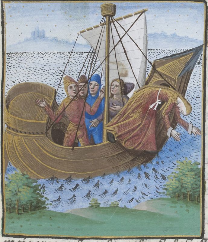 Parigi, Bibliothèque Nationale de France, Vélins 1223, f. i7r. Incunabolo miniato stampato a Parigi da Antoine Vérard il 26/04/1493. Ippona si getta in mare dalla nave per sfuggire ai suoi rapitori.