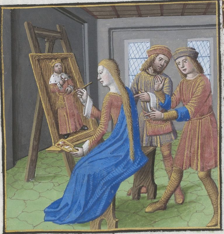 Parigi, Bibliothèque Nationale de France, Vélins 1223, f. k3v. Incunabolo miniato stampato a Parigi da Antoine Vérard il 26/04/1493. Tamari dipinge il ritratto di un re, osservata da due uomini.