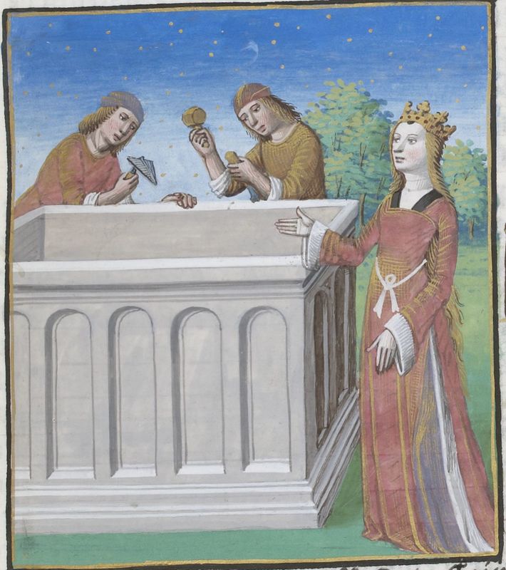 Parigi, Bibliothèque Nationale de France, Vélins 1223, f. k4r. Incunabolo miniato stampato a Parigi da Antoine Vérard il 26/04/1493. Artemisia ordina la costruzione del mausoleo per il marito defunto.