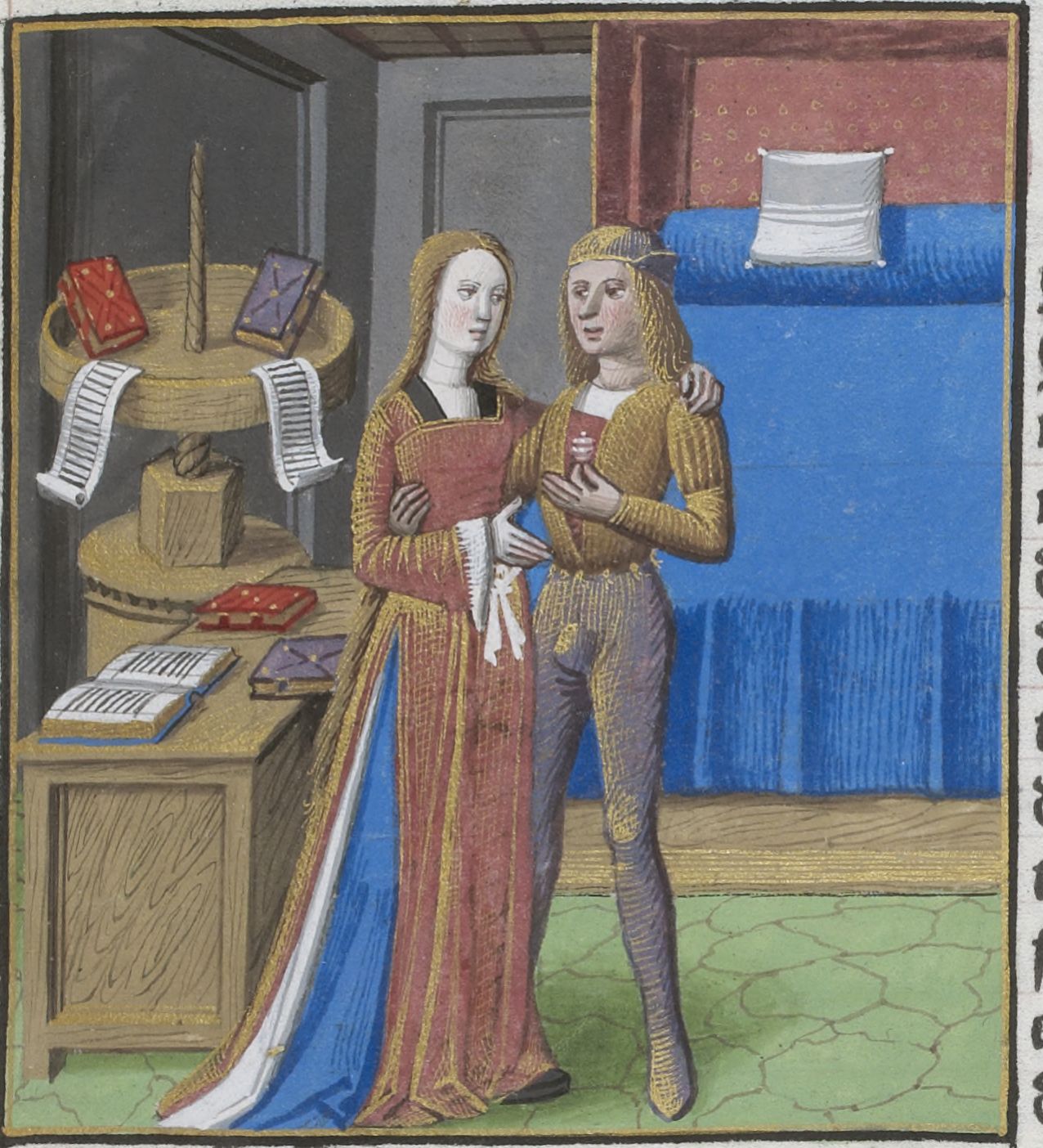 Parigi, Bibliothèque Nationale de France, Vélins 1223, f. l2r. Incunabolo miniato stampato a Parigi da Antoine Vérard il 26/04/1493. Leonzio, dinanzi ad un leggio, è corteggiata da un ammiratore.