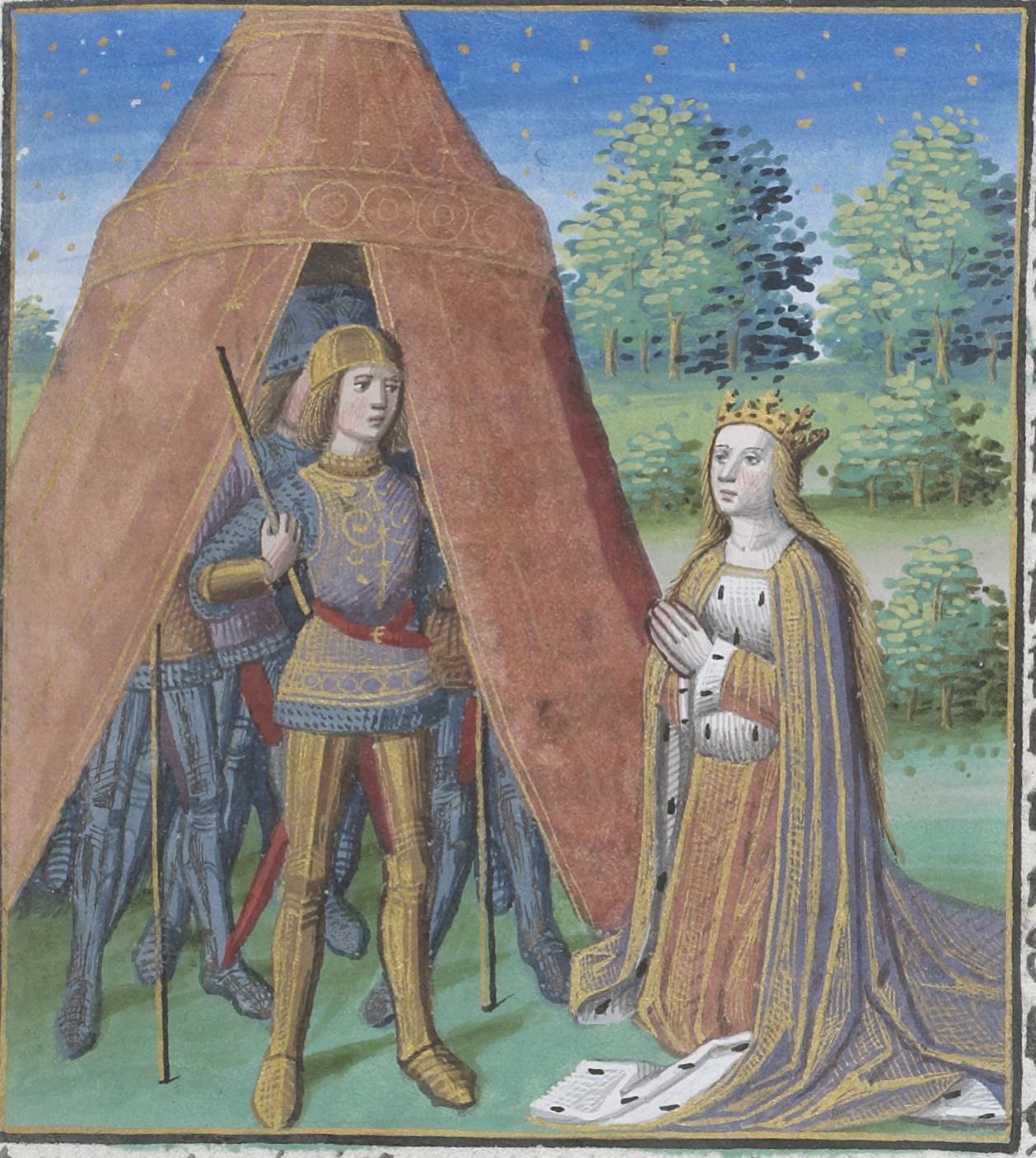 Parigi, Bibliothèque Nationale de France, Vélins 1223, f. m3r. Incunabolo miniato stampato a Parigi da Antoine Vérard il 26/04/1493. La regina Sofonisba supplica Massinissa fuori dalla sua tenda.