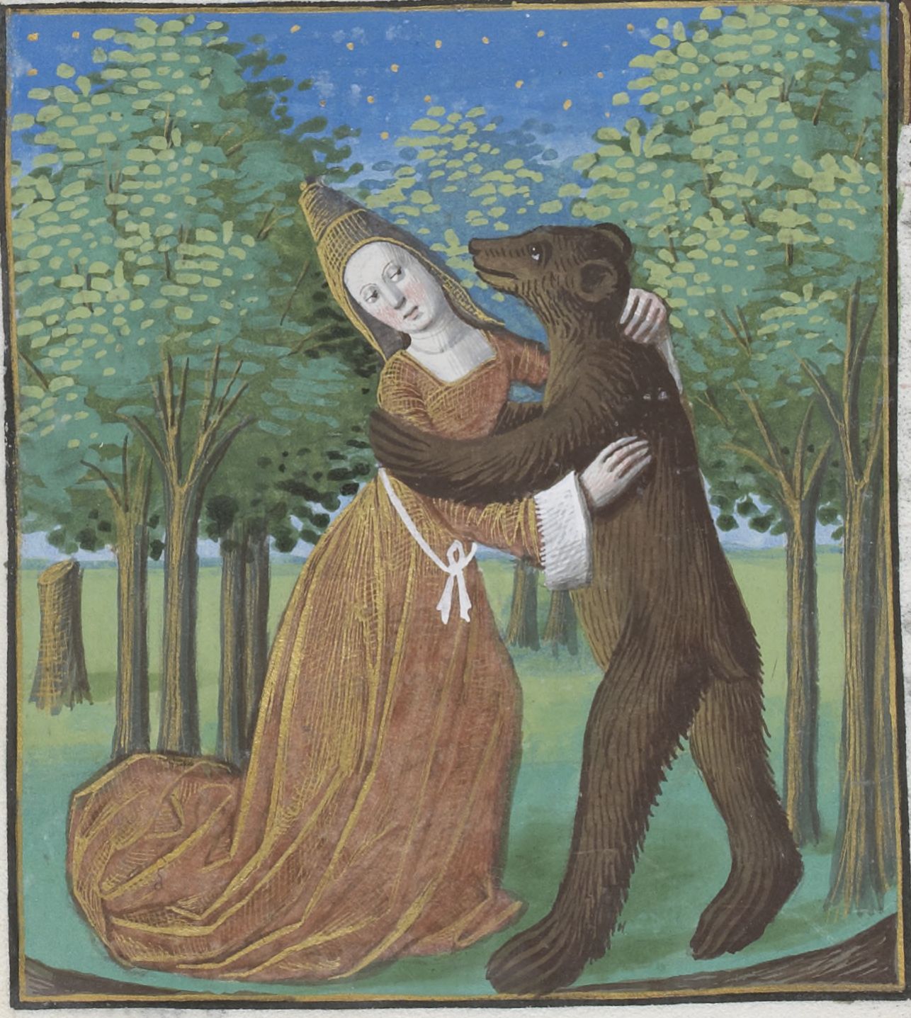 Parigi, Bibliothèque Nationale de France, Vélins 1223, f. r3v. Incunabolo miniato stampato a Parigi da Antoine Vérard il 26/04/1493. Zenobia abbracciata da un orso.