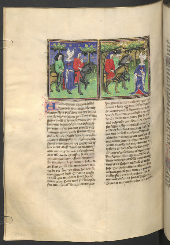 Vienna, Österreichische Nationalbibliothek, 2561, f. 225v. Madonna Oretta accetta il passaggio e la compagnia di un cavaliere; annoiata dall'uomo, Oretta scende dal cavallo.