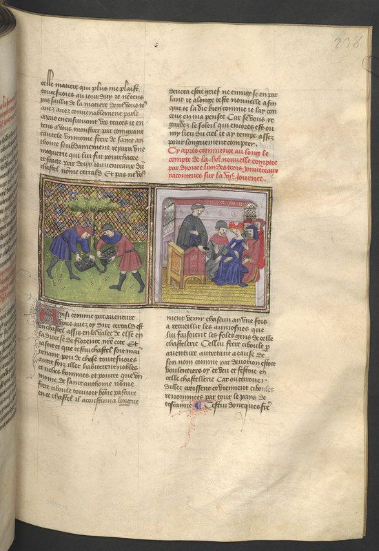 Vienna, Österreichische Nationalbibliothek, 2561, f. 238r. Giovanni del Bragoniera e Biagio Pizzini rubano a fra' Cipolla la reliquia dell'Arcangelo Gabriele; il frate segna con una croce le vesti dei paesani utilizzando dei carboni, che egli spaccia per reliquie del martirio di San Lorenzo.