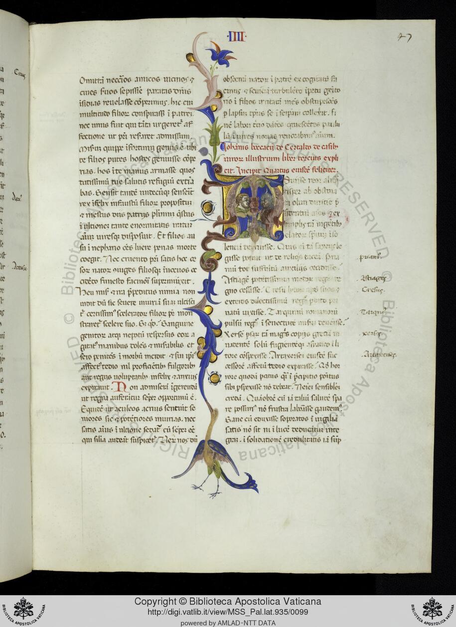 Città del Vaticano, Biblioteca Apostolica Vaticana, Pal. lat. 935, f. 47r. Il copista del manoscritto è Marco de' Rafanelli. Due uomini di profilo a mezzobusto si fronteggiano, all'interno dell'iniziale figurata M(ovisse).