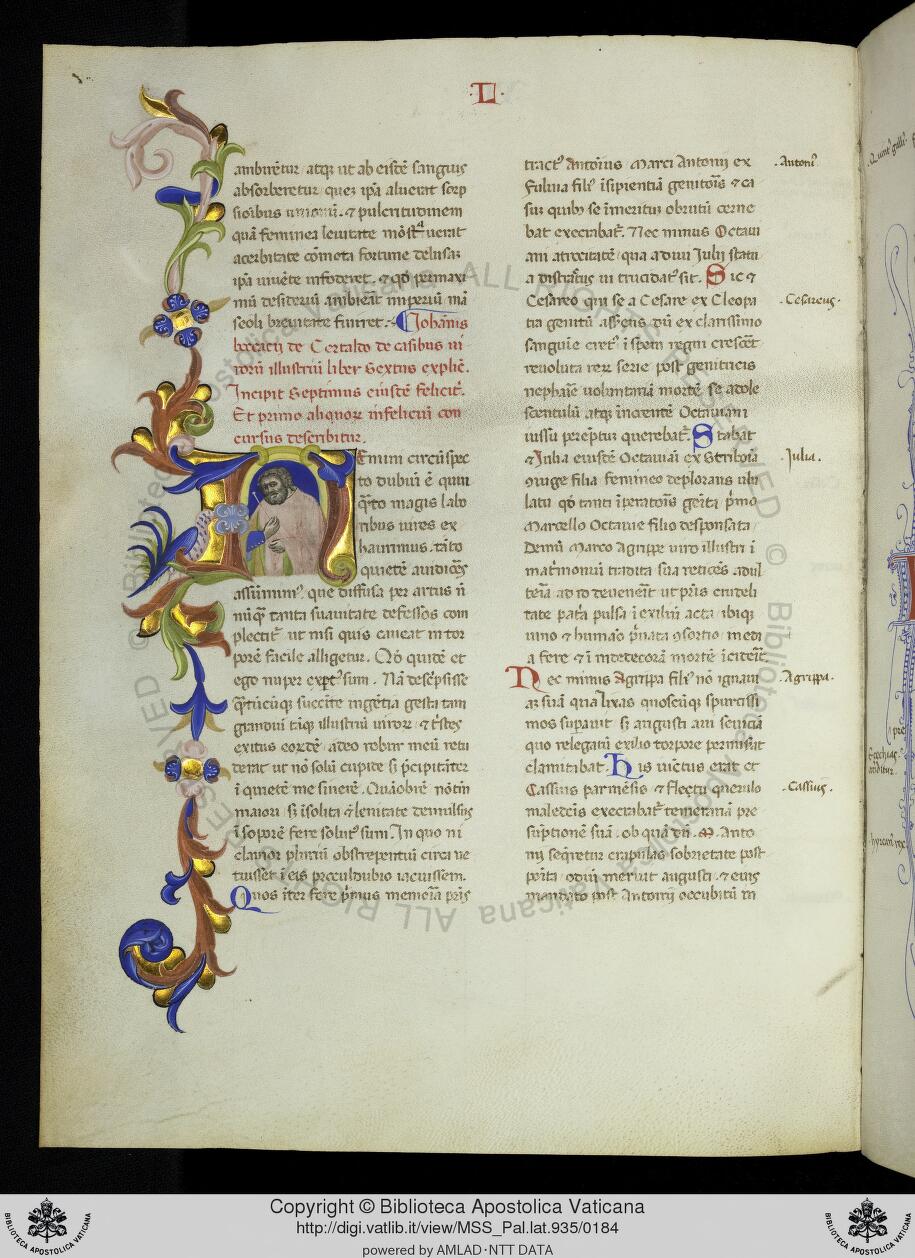 Città del Vaticano, Biblioteca Apostolica Vaticana, Pal. lat. 935, f. 87v. Il copista del manoscritto è Marco de' Rafanelli. Un uomo barbuto si trafigge con uno stiletto (?), all'interno dell'iniziale figurata N(emini).