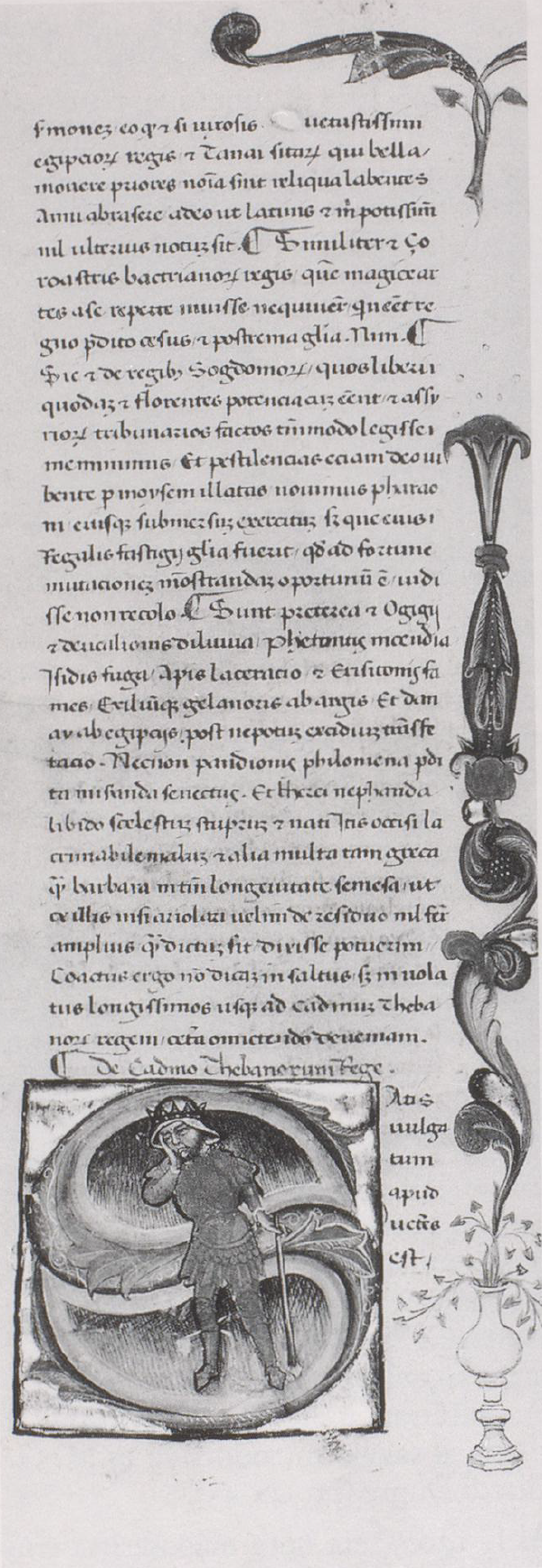 Copenaghen, Det Kongelige Bibliotek, GKS 472 2°, f. 4v. Il secondo copista del manoscritto è Beltramo di Leonardo Mignanelli da Siena. Re Cadmo appoggiato ad un bastone con il capo reclinato sulla mano, all'interno dell'iniziale figurata S(atis).