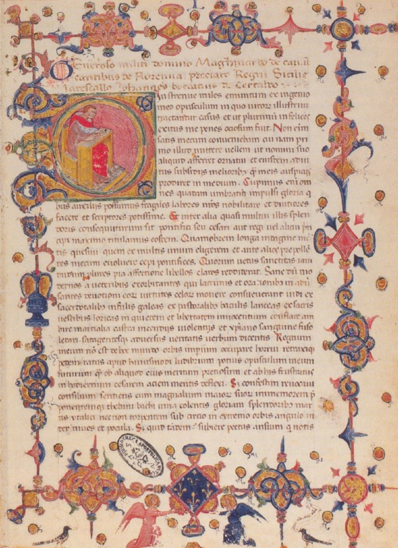 Città del Vaticano, Biblioteca Apostolica Vaticana, Ott. lat. 2145, f. 10r. L'autore Giovanni Boccaccio seduto allo scrittoio, all'interno dell'iniziale figurata D(iu).